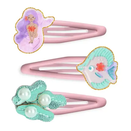 Apportez une touche féérique à votre coiffure avec ce set composé de 3 barrettes en métal ornées d’une sirène et d’un poisson en acrylique, ainsi que d’une algue en simili-cuir.