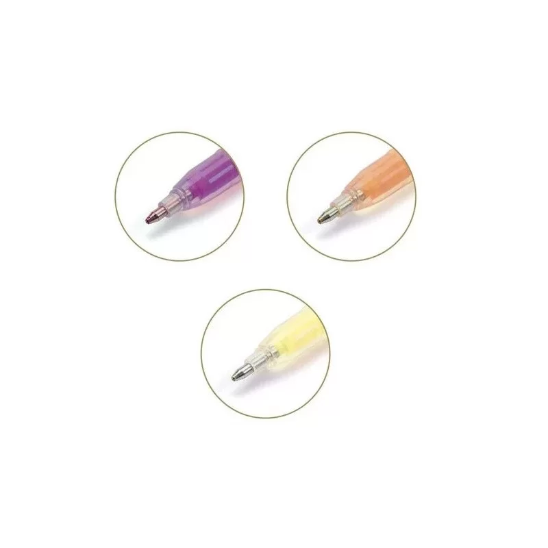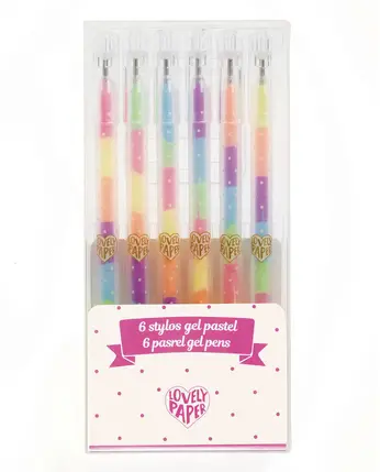 - 6 stylos gel avec 6 couleurs par stylo (jaune, orange, violet, vert, bleu et rose).