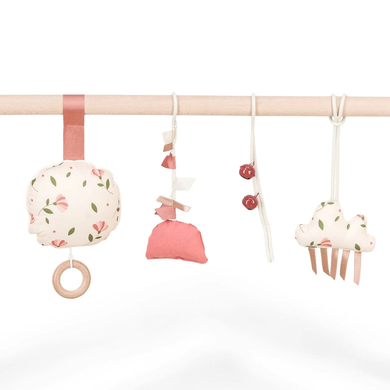 Dans ce kit, vous trouverez un nuage adorable, des grelots, une demi-lune pouët-pouët, ainsi qu’un coussin musical original rond au joli motif mixte floral beige, rose et vert. Ces accessoires d’arches originaux sont parfaits pour stimuler les sens de bébé tout en le berçant avec des mélodies apaisantes.
