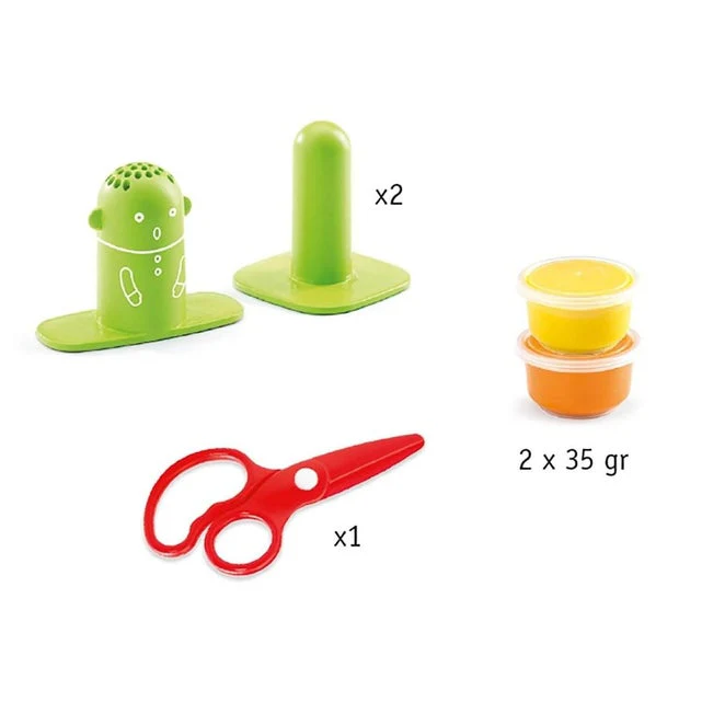 Avec ce coffret votre enfant va s’amuser à faire des cheveux en pâte à modeler. faîtes une boule, placez là sous la tête du bonhomme, placer le bonhomme sur son socle et appuyez pour faire sortir les cheveux. utilisez le ciseaux pour lui faire une petite coupe!