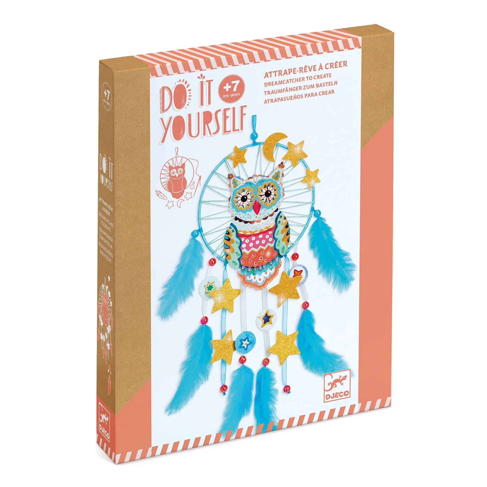 Un kit créatif complet pour réaliser un attrape-rêve scintillant, en ornant l’image de la chouette de fils colorés, de perles, de rubans, de plumes. Un bel objet de décoration à suspendre dans sa chambre pour éloigner les mauvais rêves…