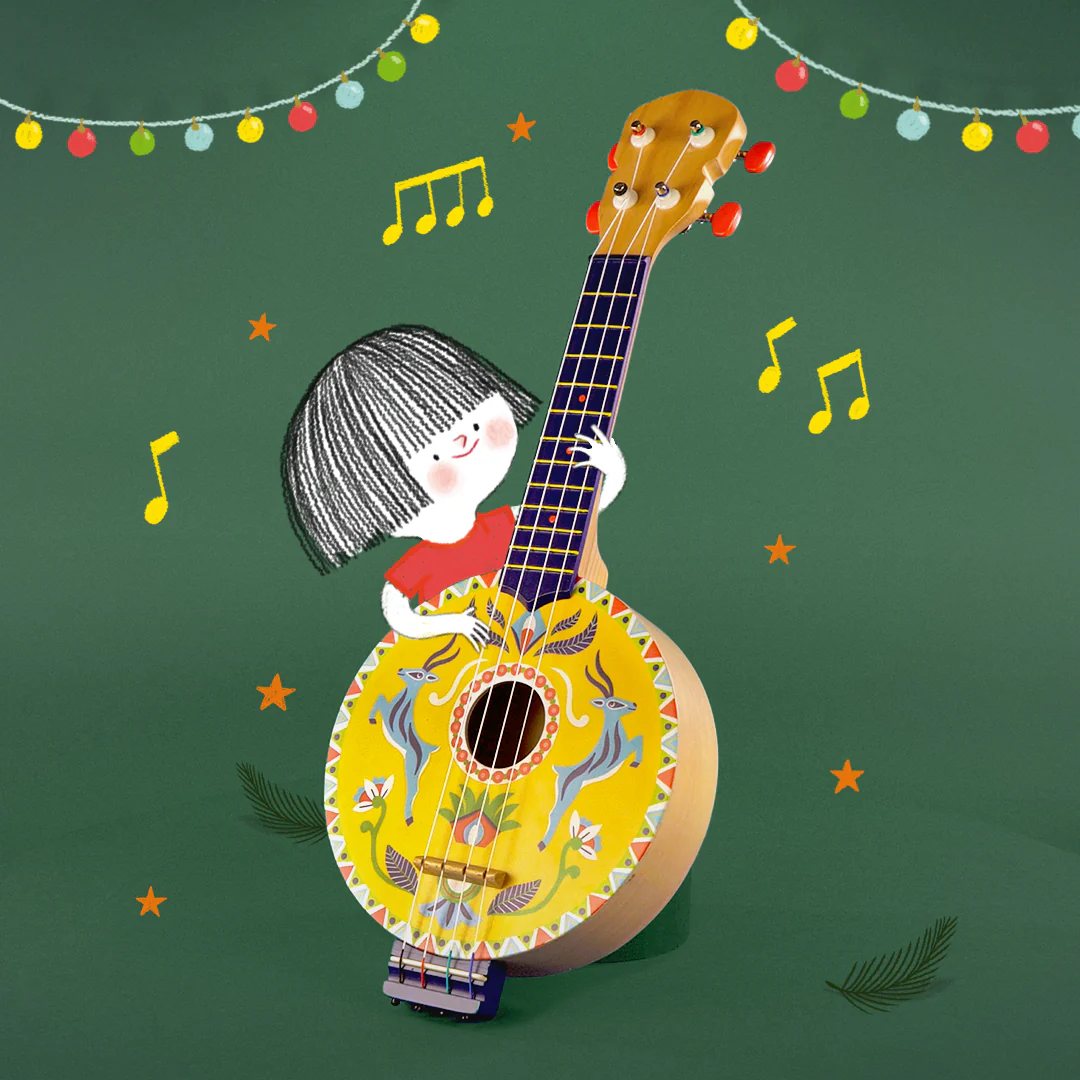 Un magnifique banjo à 4 cordes, en bois et joliment illustré. Idéal avant la guitare pour s’éveiller à la musique dès 3 ans.