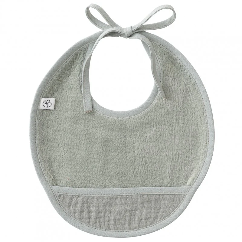 Un joli bavoir bi-matière idéal dès la naissance, en éponge bambou toute douce et gaze de coton ton sur ton.