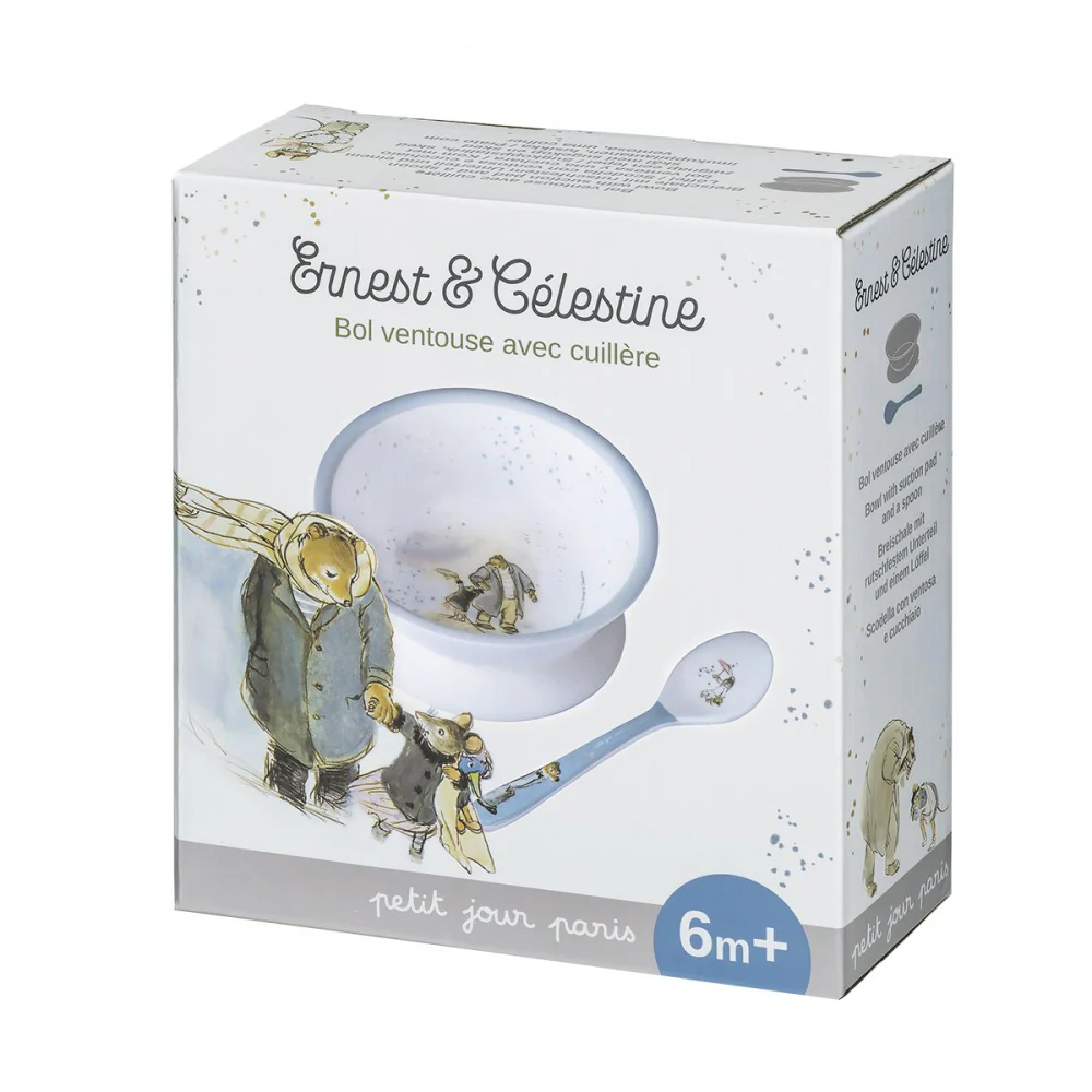 Ce bol ventouse et cuillère Ernest & Celestine est parfait pour apprendre à bébé à manger tout seul et en toute sécurité ! Sa ventouse permet à son bol de ne pas bouger et la cuillère ronde sans arêtes est spécialement conçue pour ses petits doigts.