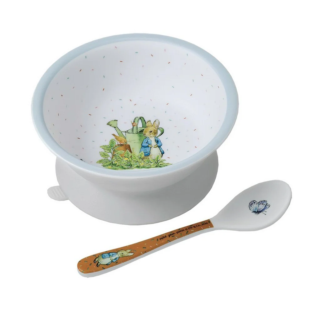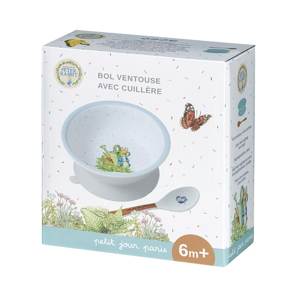 Ce bol ventouse et cuillère Pierre Lapin est parfait pour apprendre à bébé à manger tout seul et en toute sécurité ! Sa ventouse permet à son bol de ne pas bouger et la cuillère ronde sans arêtes est spécialement conçue pour ses petits doigts.