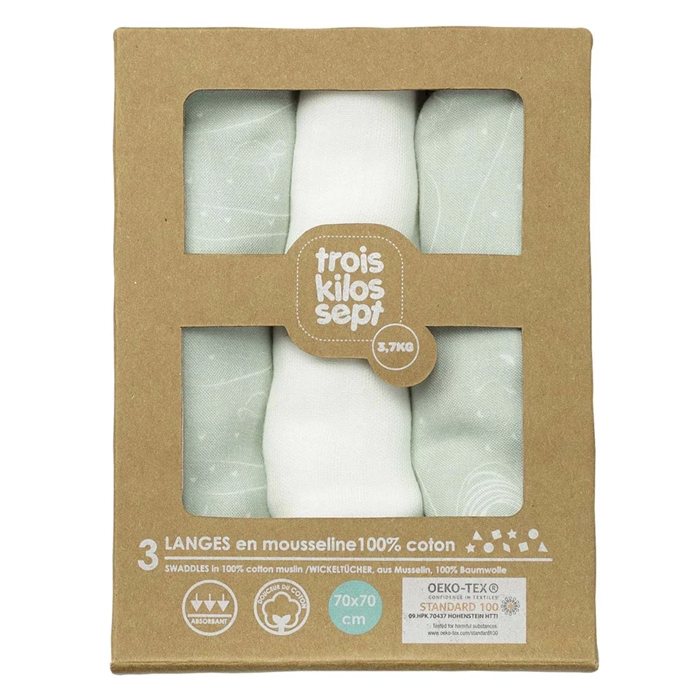 OFFERT PAR Eléonore et Cédric MDV24/08/2024 E21062024 À la fois doux pour l’environnement et le portefeuille, ce lot de 3 langes Oeko-tex de dimension 70x70cm est l’allié des repas de votre bébé. Avec des tons beiges et des motifs océan au coloris vert d’eau, au caractère mixte et intemporel