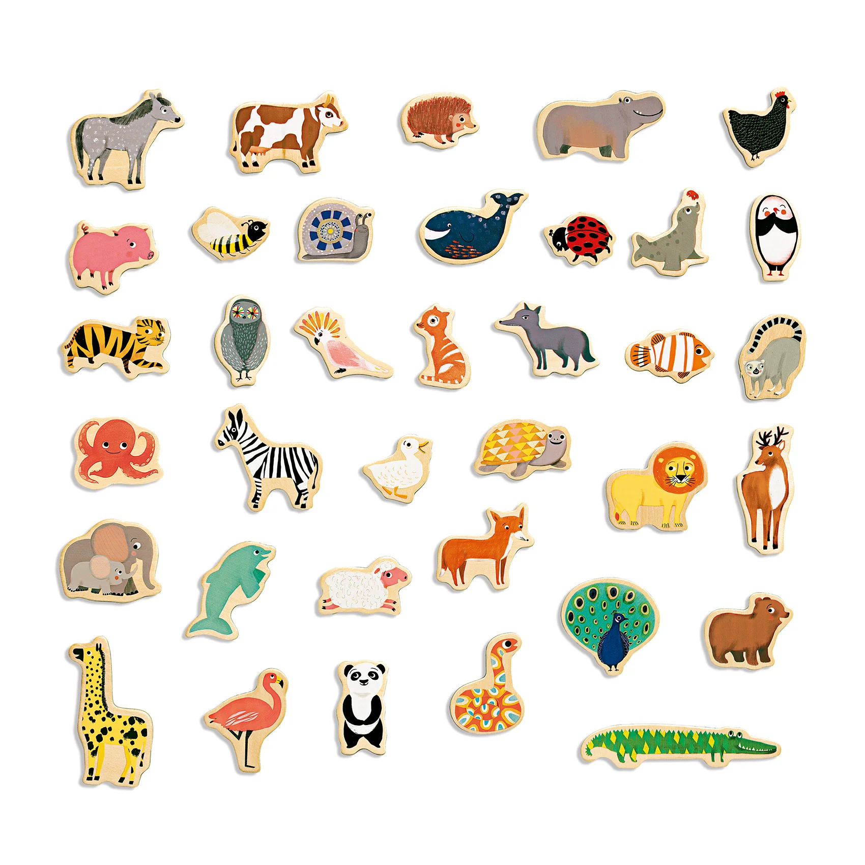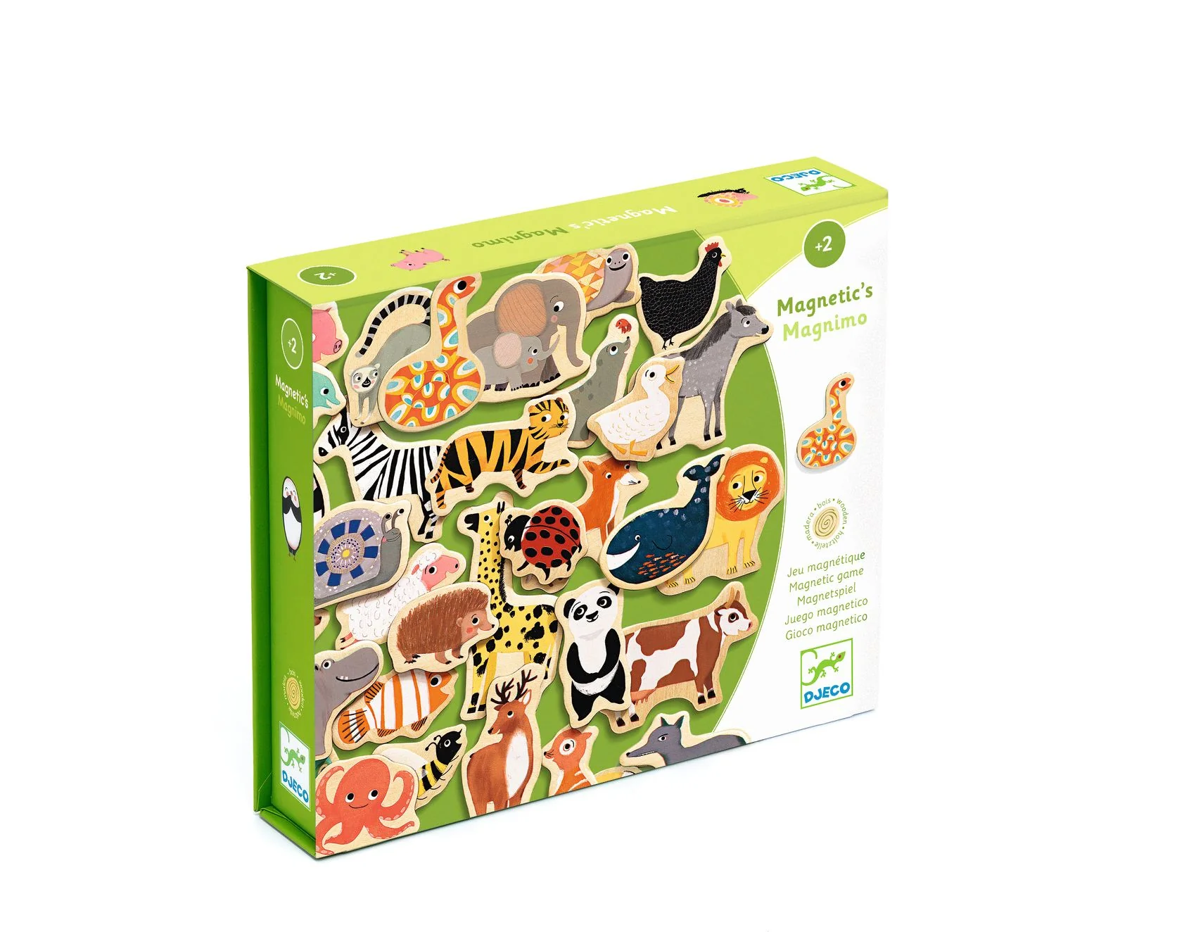 Magnimo est un imagier magnétique des animaux du monde. L’enfant voyage avec ce coffret de 36 animaux magnétiques en bois.