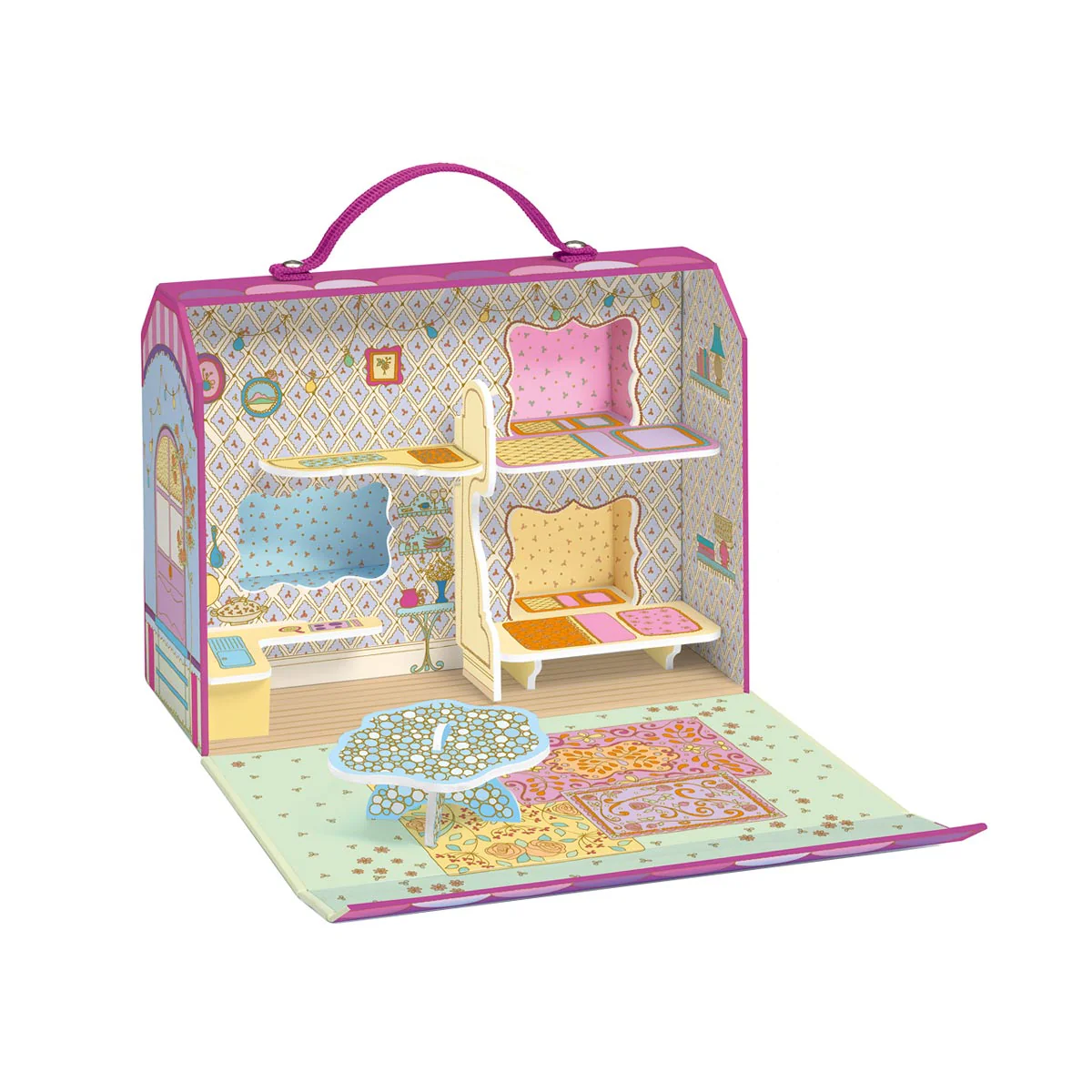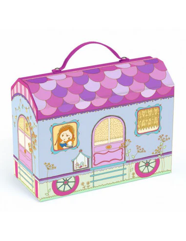 Découvrez la maison de Bluchka et indie pour les figurines Tinyly de Djeco, un décor en forme de valise et deux figurines attachantes et fantaisistes pour les enfants à partir de 4 ans. Cette jolie maison illustrée représentant une roulotte est très facile à transporter grâce à sa poignée et s’ouvre pour y découvrir un décor de maison de poupées pour jouer avec vos figurines Tinyly. Dans cette jolie maison, vous y découvrirez un intérieur décoré avec une cuisine, des chambres et une table pour manger.
