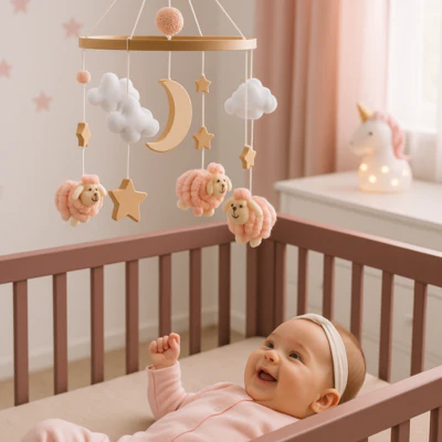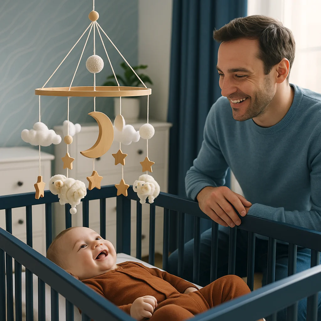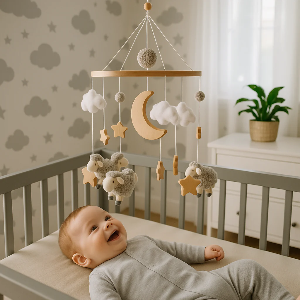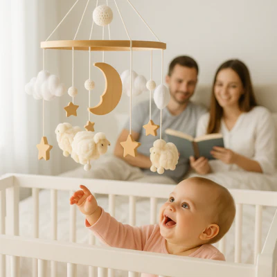 « Depuis que nous avons installé le mobile avec ses petits moutons en bois au-dessus du lit de Lucas, c’est incroyable comme il s’est éveillé ! Il tend ses petites mains vers les figurines et gazouille joyeusement. »