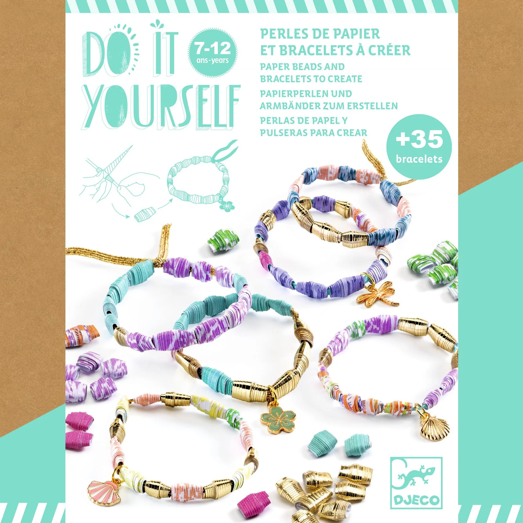 Un coffret créatif pour réaliser une multitude de bracelets colorés en fabriquant soi-même les perles en papier. L’enfant découpe les feuilles de motifs imprimés en languettes, qu’il encolle puis enroule autour d’un bâtonnet. Les perles ainsi fabriquées sont prêtes à être passées sur un fil élastique pour créer de jolis bijoux ! Certains pourront être agrémentés avec les charms fournis.