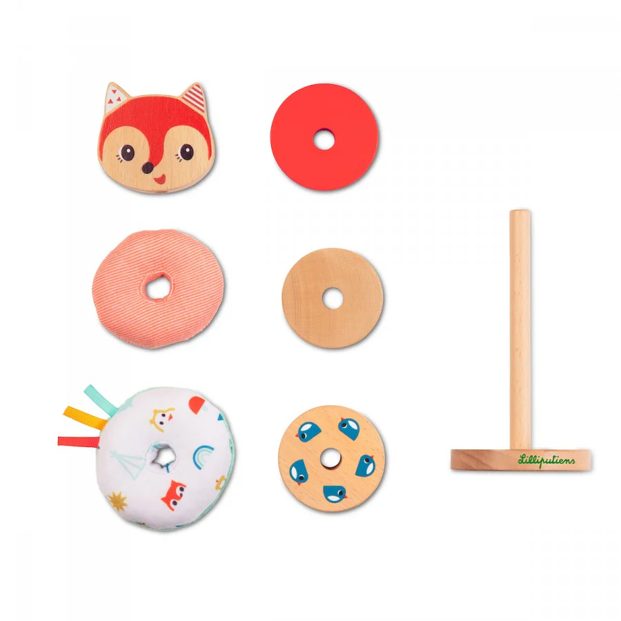 Jolie pyramide à empiler pour développer la motricité fine. Empilez les pièces de différents matériaux et de différentes couleurs de manière créative. La variété de formes, de couleur et de matériel stimulent les sens.
