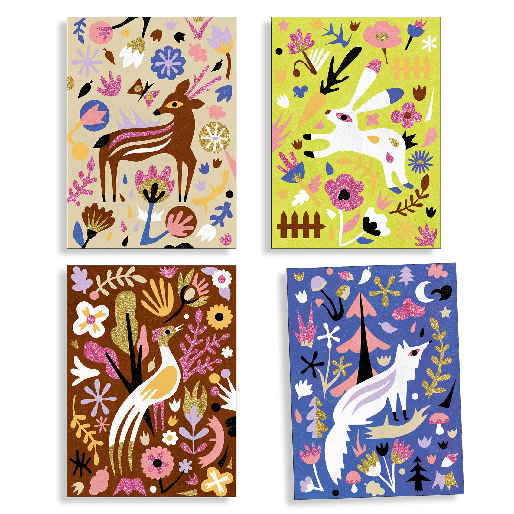 4 tableaux sur le thème de la forêt à illuminer avec du sable coloré et des paillettes.