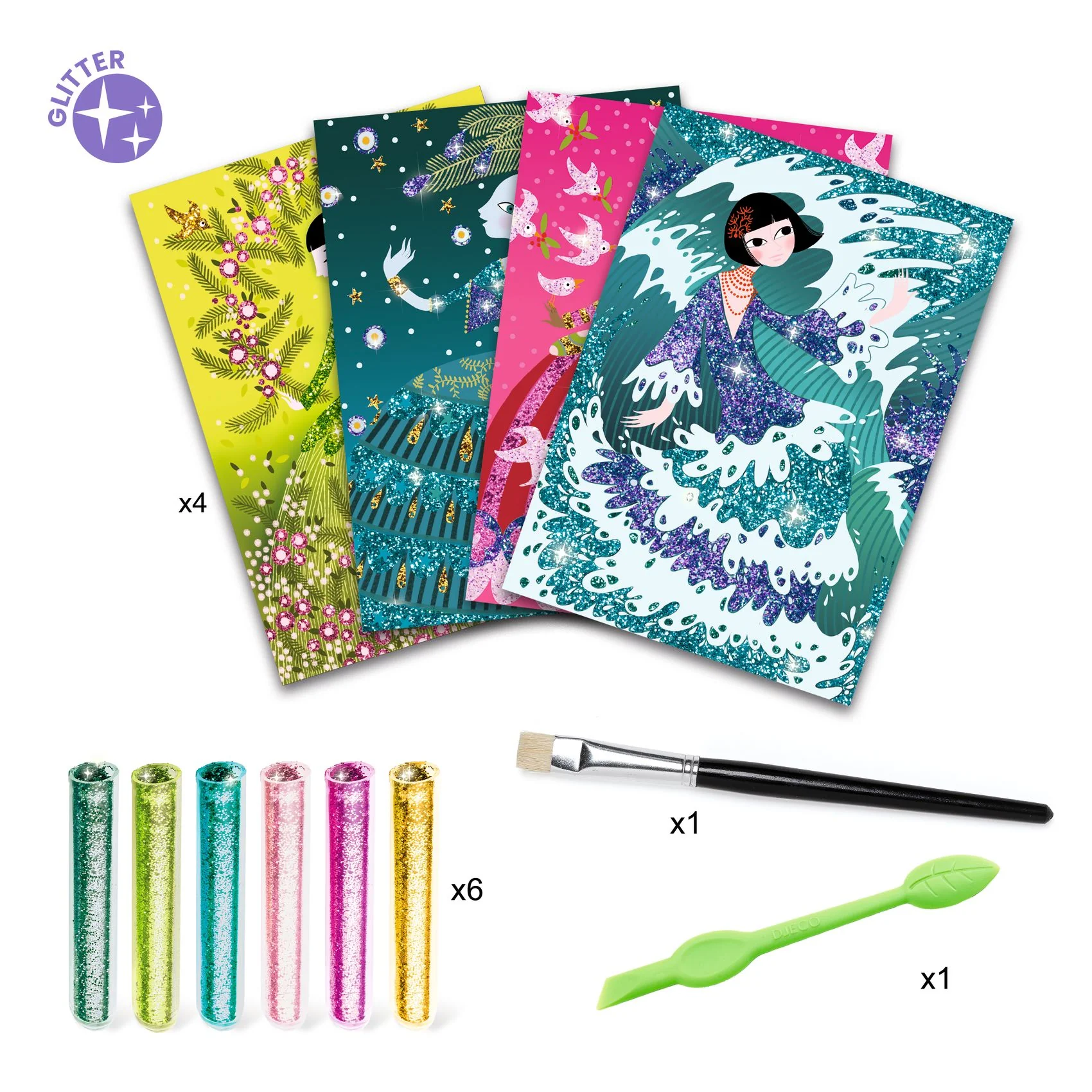 Contenu : 4 cartes imprimées et préencollées (15 x 21 cm), 6 tubes de paillettes, 1 outil plastique, 1 pinceau brosse et 1 livret d’explications pas à pas en couleurs.
