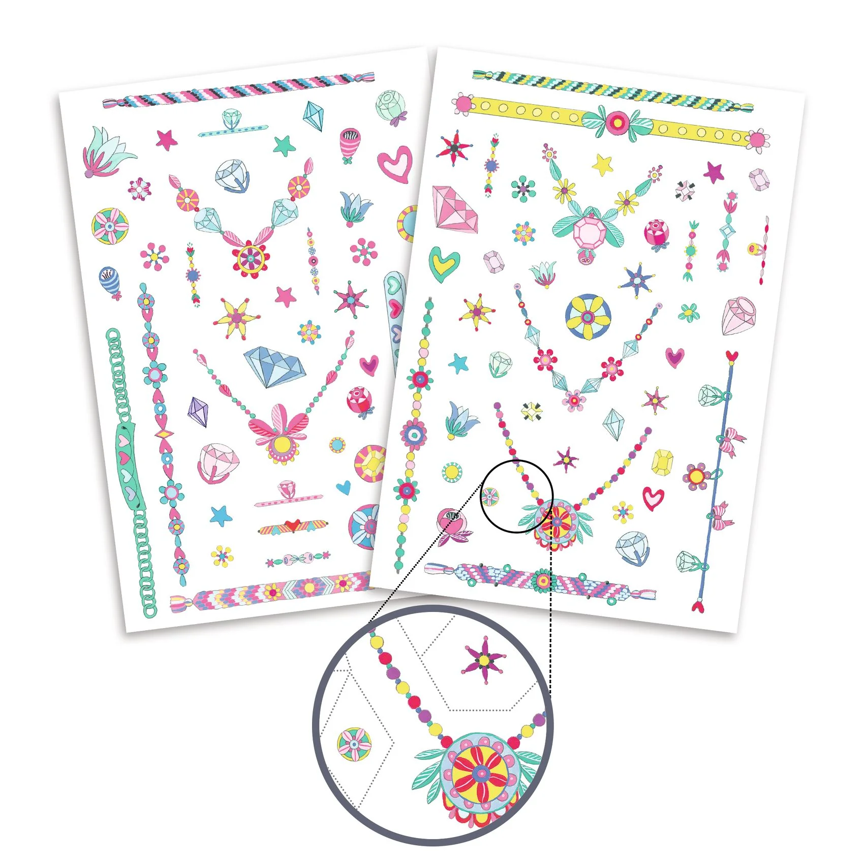 Deux planches de tatouages bijoux temporaires aux couleurs acidulées. Bracelet, bagues, colliers ou petites boucles, il y en a pour tous les goûts. Et pour le plus grand plaisir des enfants, ils sont parsemés de détails roses et jaunes fluo ! Faciles à utiliser, ils sont prédécoupés et s’appliquent avec un peu d’eau. Testés dermatologiquement.